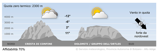 Su tutto l'Alto Adige si alterneranno sole e nubi senza precipitazioni. Tempo migliore al sud e nelle Dolomiti, più nubi lungo la cresta di confine.